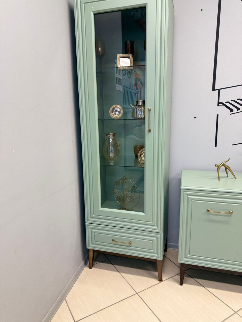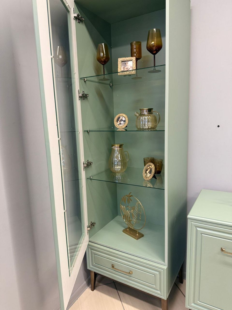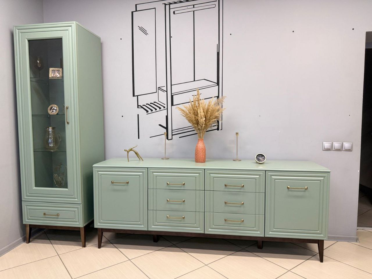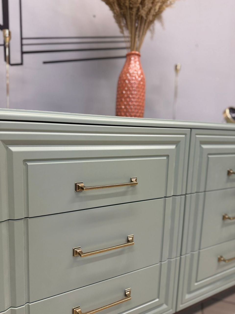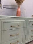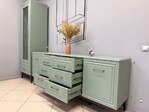 Спокойный мягкий мятный оттенок спальни "Гориция" отлично расширяет пространство, делает комнату уютной, не перегружая обстановку. Изящная фрезеровка на фасадах выглядит стильно и современно. Кровать из массива, тумбы и комоды на элегантных опорах цвета дуб коньяк, вместительные распашные шкафы для одежды - в спальный гарнитур входит все, что нужно для спокойного отдыха и рациональной организации пространства.