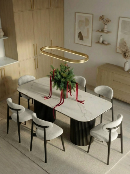 Стол овальный (нераздвижной) со столешницей из листовой керамики на подложке из мдф. Стоит на двух тумбовых опорах.