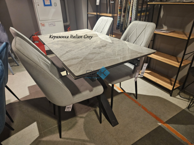 Столешница выполнена из: керамики (5,6 мм) + МДФ. Рама металлическая, крашенная. Подстолье: опоры металлические.