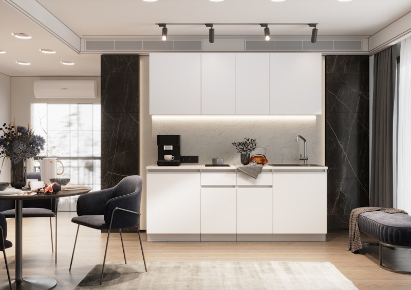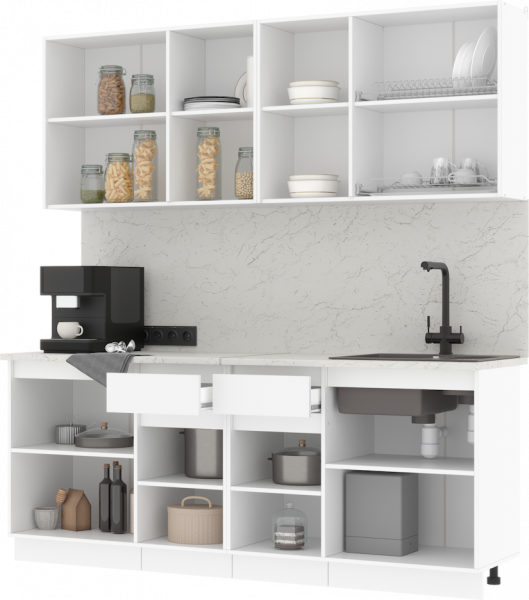 Белоснежный корпус и фасады в дуэте со столешницей под белый мрамор. Это воплощение свежести, света и универсальности. Идеальный фон для любого интерьера, который будет оставаться актуальным и воздушным всегда.