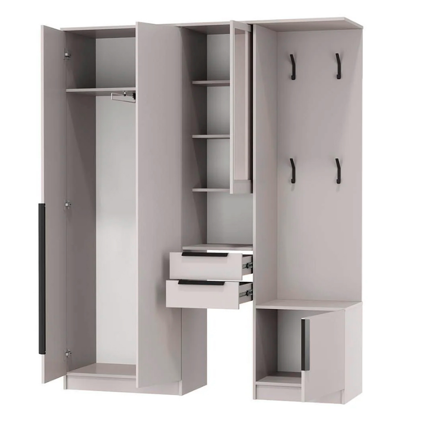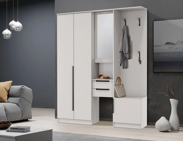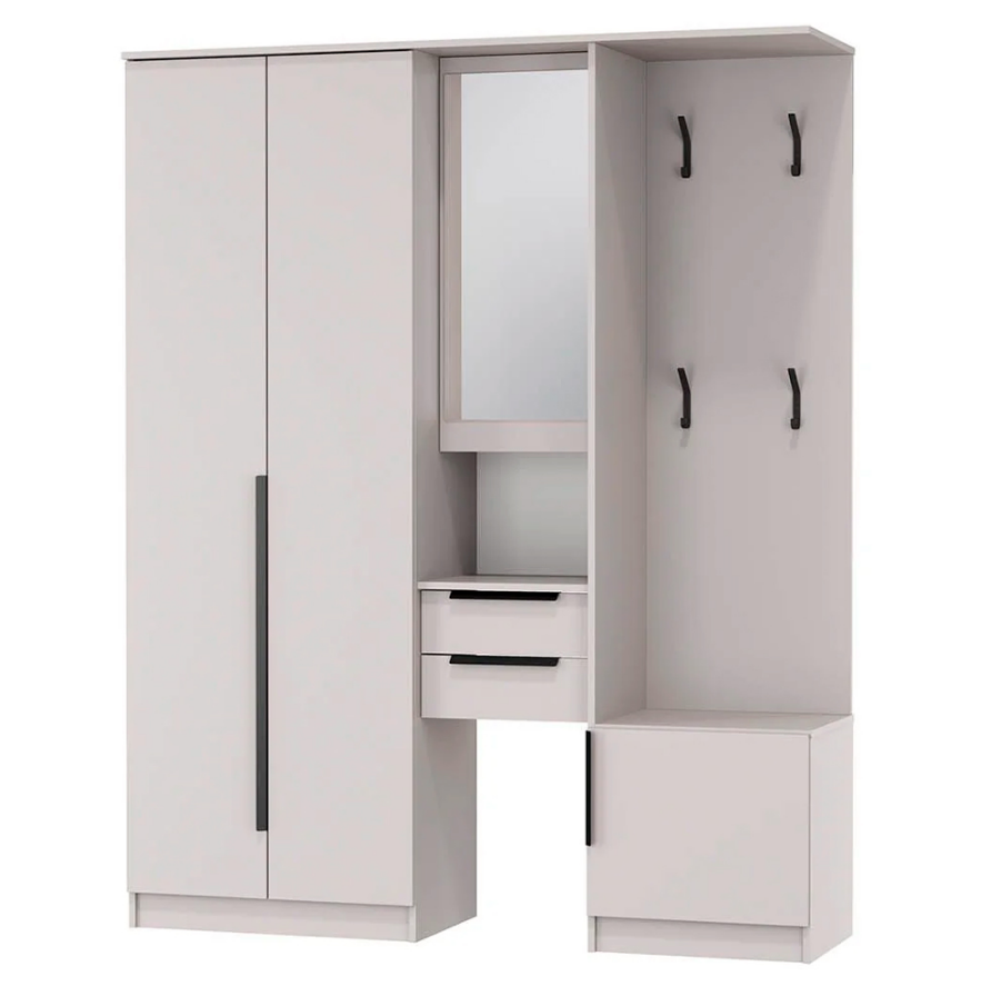 С левой стороны расположен шкаф для одежды, который обеспечит удобное хранение ваших вещей. Справа находится открытая вешалка и тумба для обуви.