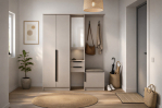 С левой стороны расположен шкаф для одежды, который обеспечит удобное хранение ваших вещей. Справа находится открытая вешалка и тумба для обуви.