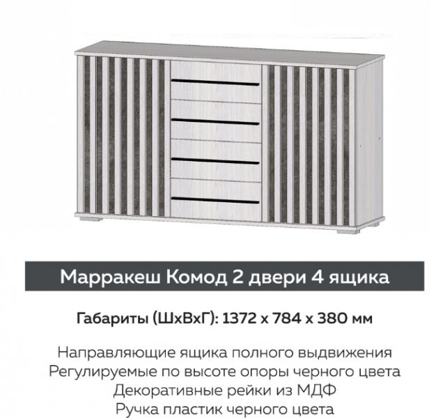 Главная / Каталог / Мебель для спальни / Спальни / Спальня Марракеш Анкор / Спальня Марракеш Анкор Комод 2 двери 4 ящика