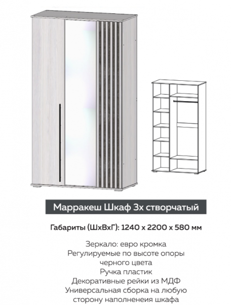 Главная / Каталог / Мебель для спальни / Спальни / Спальня Марракеш Анкор / Спальня Марракеш Анкор Шкаф 3х створчатый на 1240