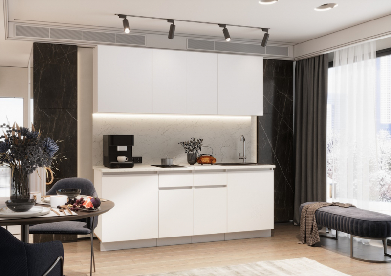 Белоснежный корпус и фасады в дуэте со столешницей под белый мрамор. Это воплощение свежести, света и универсальности. Идеальный фон для любого интерьера, который будет оставаться актуальным и воздушным всегда.