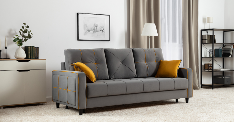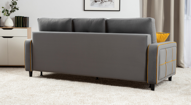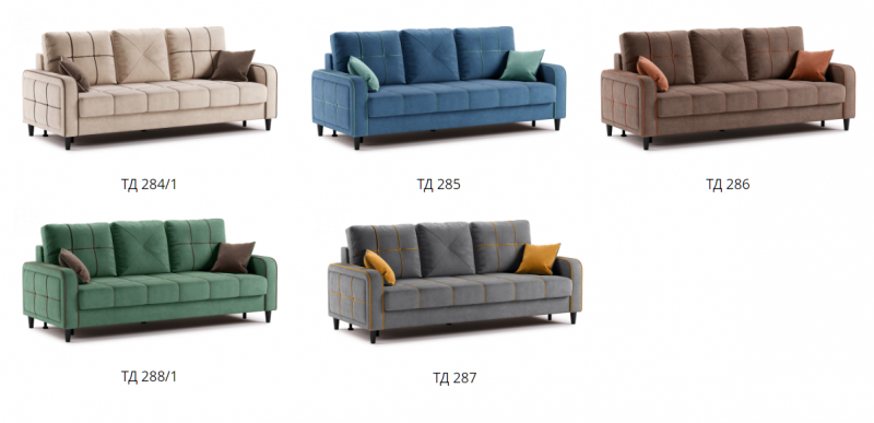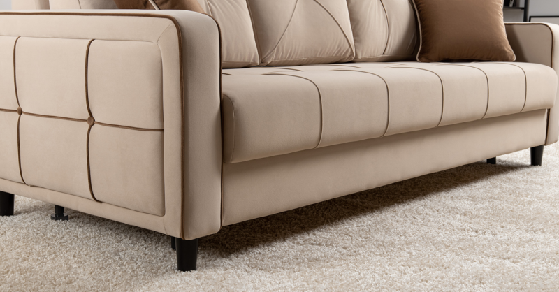 на подушке и вставке подлокотников. По торцам подлокотников и думках контрастный декоративный