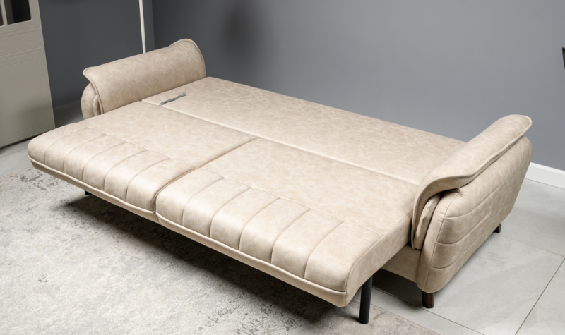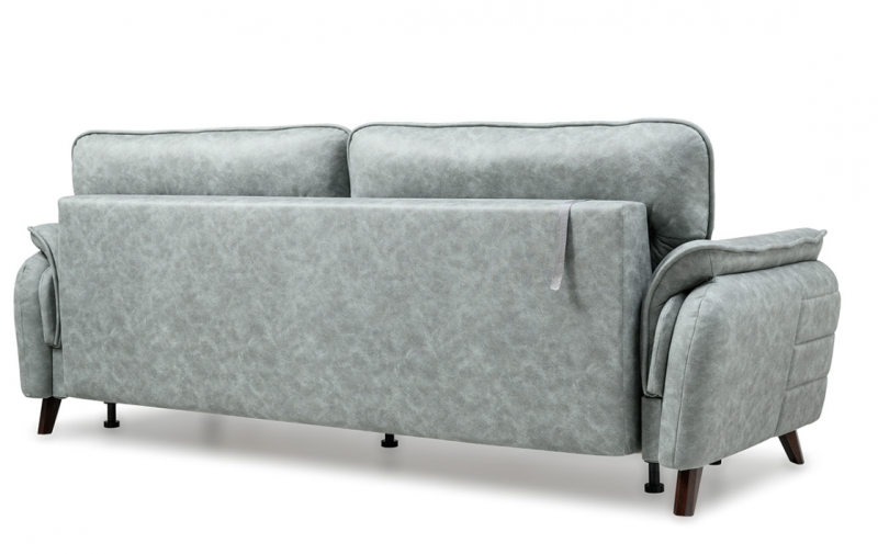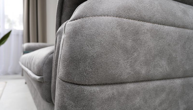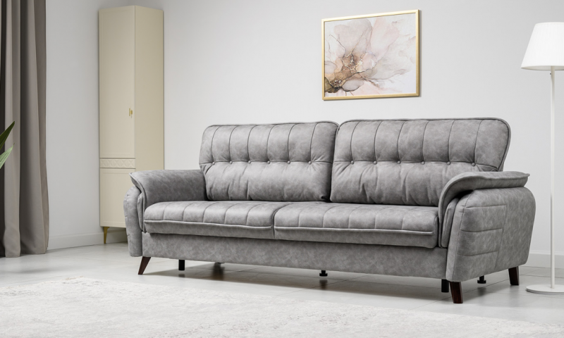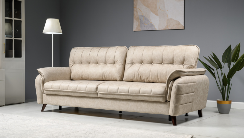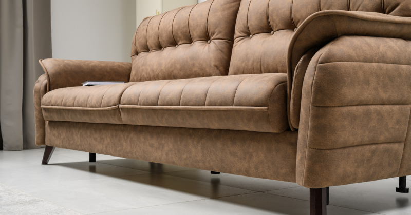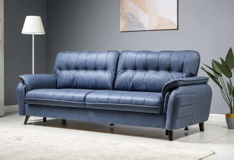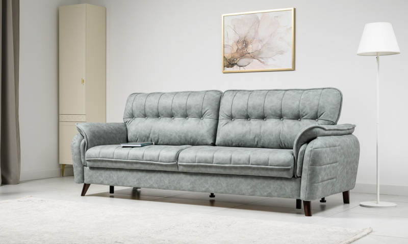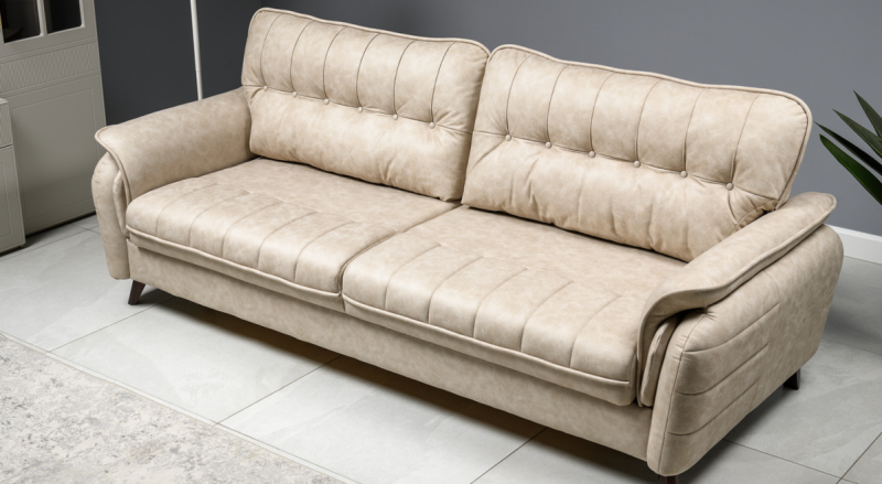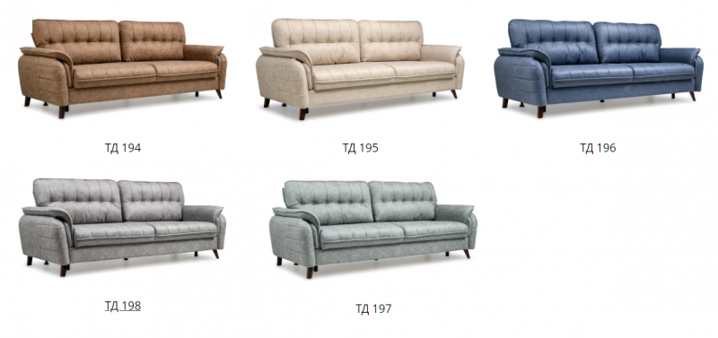 Декоративные канты на подушках дивана, подлокотниках и сиденье. Пуговицы на подушках. Стежка на передней части сиденья и внешней части подлокотника. Защипы на верхней части подушки. Втяжки с пуговицами на приспинных подушках