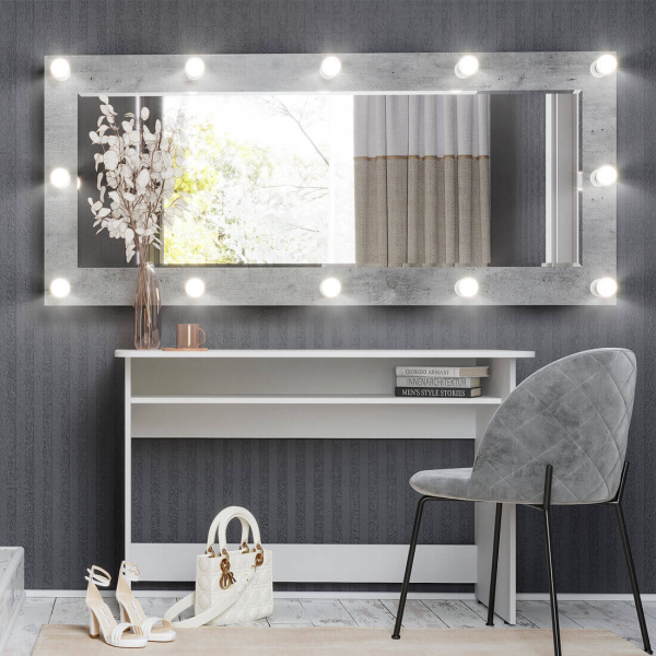 • рама зеркала изготовлена из ЛДСП в цвете бетон и дополнена по всему периметру лампочками с выключателем.