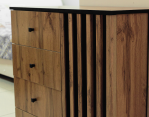 Дизайн серии сочетает в себе ряд контрастов. Древесный декор корпуса и фасадов неизменно ассоциируется с теплотой и домашним уютом, при этом чтобы обстановка получилась оригинальной, а не перегруженной, в дизайн модулей добавлен контраст с черными элементами. Черные металлические ручки и опоры позволяют получить красивую комбинацию, подчеркнуть текстуру, расставить акценты.